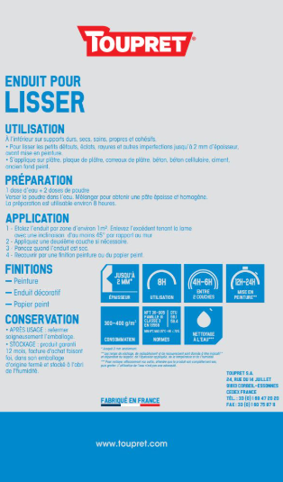 Enduit de lissage en poudre Extra liss TOUPRET blanc 1 kg