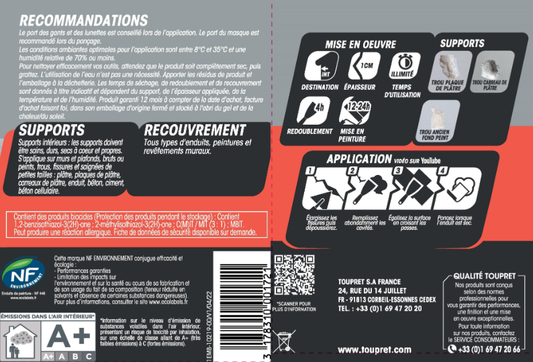 Enduit de rebouchage en poudre Haute performance TOUPRET blanc 5 kg