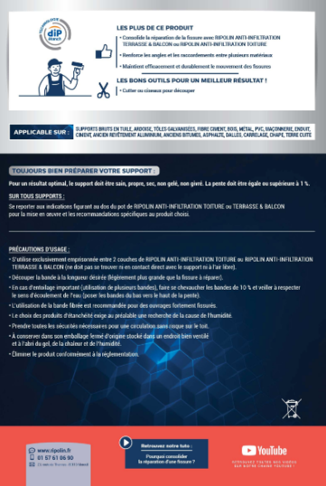 Bande fibrée s’utilisant en complément de Ripolin Anti-Infiltration Toiture ou Terrasse & Balcons en cas de fissure ou défaut de raccordement de 1 à 2mm de largeur. Permet de consolider la réparation pour une efficacité durable de l’étanchéité.