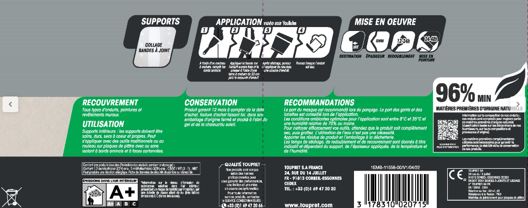 Enduit pour coller les bandes à joints et lisser. C'est un enduit en pâte prêt à l'emploi pour vous faire gagner du temps dans vos travaux. Il est hautement garnissant et dispose d'une finition soignée. L'application et le ponçage sont faciles.