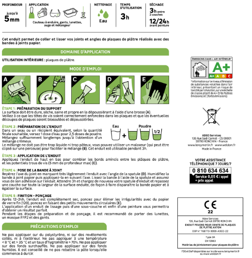 Enduit pour joints de plaques de plâtre AXTON, en poudre, idéal pour coller et lisser vos joints, angles de plaques de plâtre réalisés avec des bandes à joints papier. Grâce à sa formule, l'enduit est facile d'utilisation, a une bonne glisse sur le support.