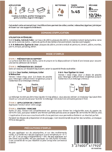 Enduit colle universel AXTON, en poudre, idéal pour coller, sceller, reboucher, égaliser, jointoiyer et lisser sur vos supports intérieurs. Grâce à sa formule, l'enduit est multifonctions et peut répondre à 6 usages différents. L'enduit possède un pouvoir collant élevé et sèche rapidement.