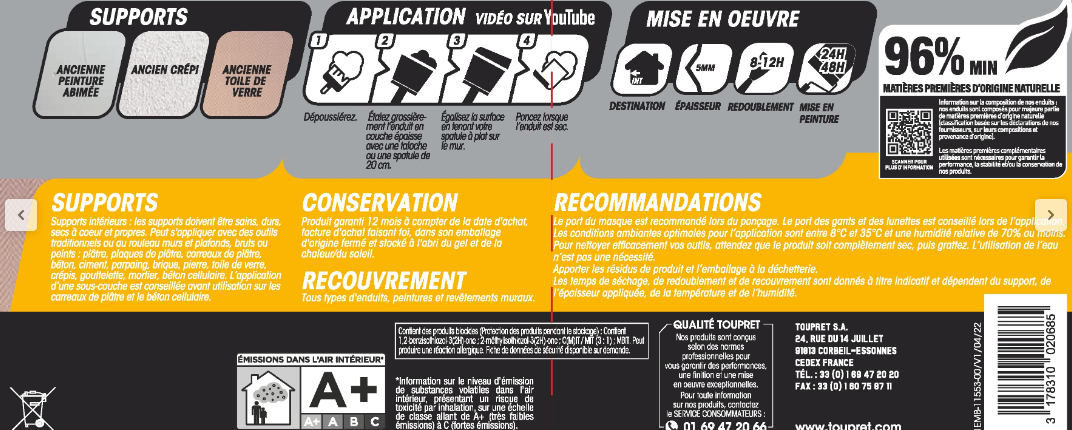 | Nom du produit | Enduit de rénovation et garnissant |