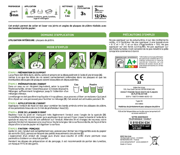 | Nom du produit | Enduit pour bande à joint |