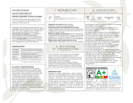 Notre gamme de peinture Envie ! est une véritable source d’inspiration pour se sentir naturellement bien chez soi. Un nuancier unique et sensoriel, qui reflète la beauté des couleurs de notre quotidien. Faites le choix d’une peinture hautement décorative, subtile et raffinée, aspect velours couvrant et facile d’entretien. La peinture Envie ! est à base de résine biosourcée à 96 %, soit 64 % de composants d’origine naturelle. Son Écolabel vous garantit une peinture couleur performante avec un faible taux de COV (A+). Envie ! est fabriquée en France, aux pieds des Pyrénées. BEIGE LIN. Aspect velours. Murs, boiseries, radiateurs. Lessivable. Classe COV A+. Rendement 10m²/l