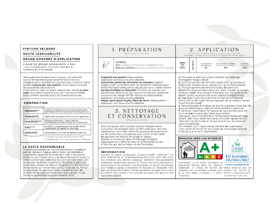 | Indication du geste de tri (triman) | Nos produits et emballages peuvent faire l'objet d'une consigne de tri. Pour en savoir plus : www.quefairedemesdechets.fr |