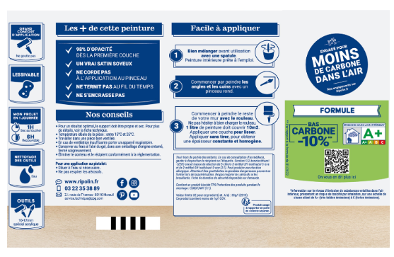 | Indication du geste de tri (triman) | Nos produits et emballages peuvent faire l'objet d'une consigne de tri. Pour en savoir plus : www.quefairedemesdechets.fr |
