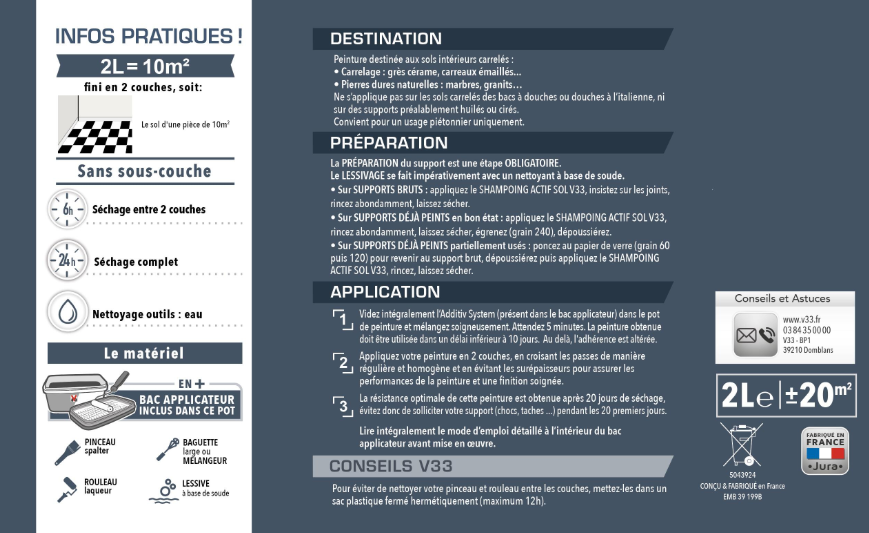 Cette peinture vous permet de rénover facilement les sols intérieurs carrelés avec de jolis coloris tendance. Pratique, vous n'aurez pas besoin d'appliquer de sous-couche au préalable. Grâce à la technologie céramique qui renforce les performances du film de peinture, elle est très résistante aux passages réguliers, elle résiste aux chocs et ne s'écaille pas pour une plus longue durée dans le temps. Elle est compatible avec les sols chauffants (il vous suffira d'arrêter le chauffage quelques jours avant application, puis le remettre en marche progressivement une semaine minimum après). Cette peinture n'est pas recommandé pour un usage à l'intérieur de la douche.