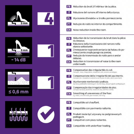 | Réduction de bruit de pas dans la pièce du dessous (en dB) | 14 |