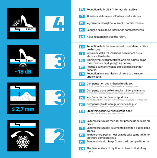 | Usage 1 | Sous-couche SILENCE COMPENSATION: pour protéger les planchers flottants (stratifié ou parquet) en les rendant plus silencieux, en empêchant tout froid venant du rez-de-chaussée et en compensant les inégalités modérées à l'étage précédent |