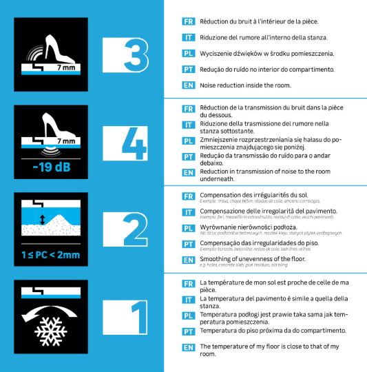 | Usage 1 | Sous-couche Silence pour protéger les sols flottants (stratifié ou parquet) en les rendant plus silencieux |