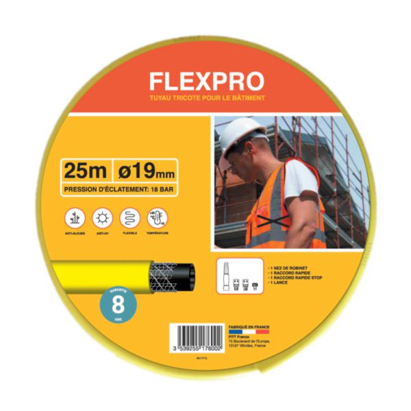| Description | Composition du Kit : - 4 raccords plastiques automatiques - 1 tuyau de 25 m FLEXPRO avec renfort tricoté Longueur : 25 m Ø 19 mm Pression de service : 7 bar Pression d'éclatement : 21 bar |